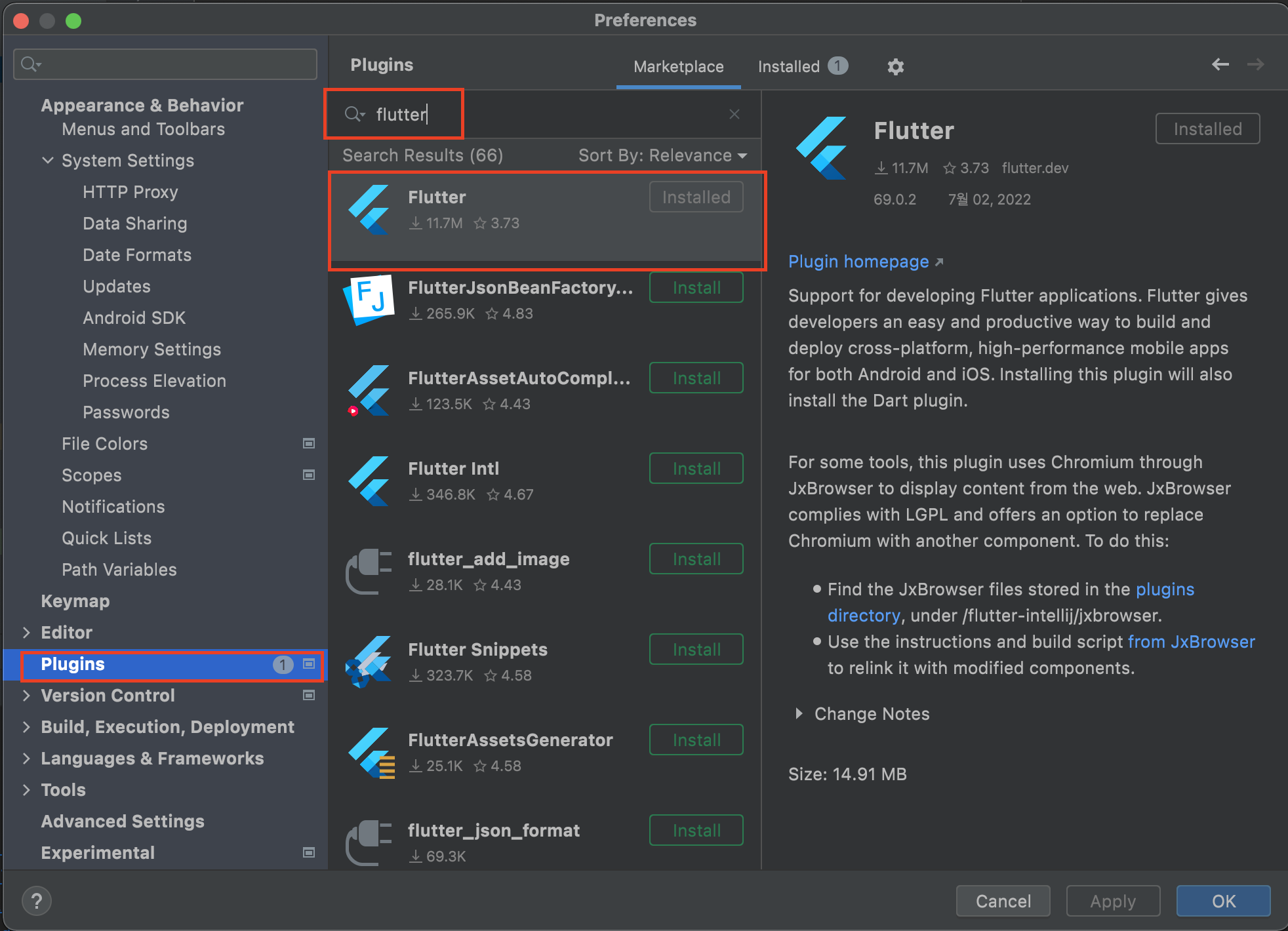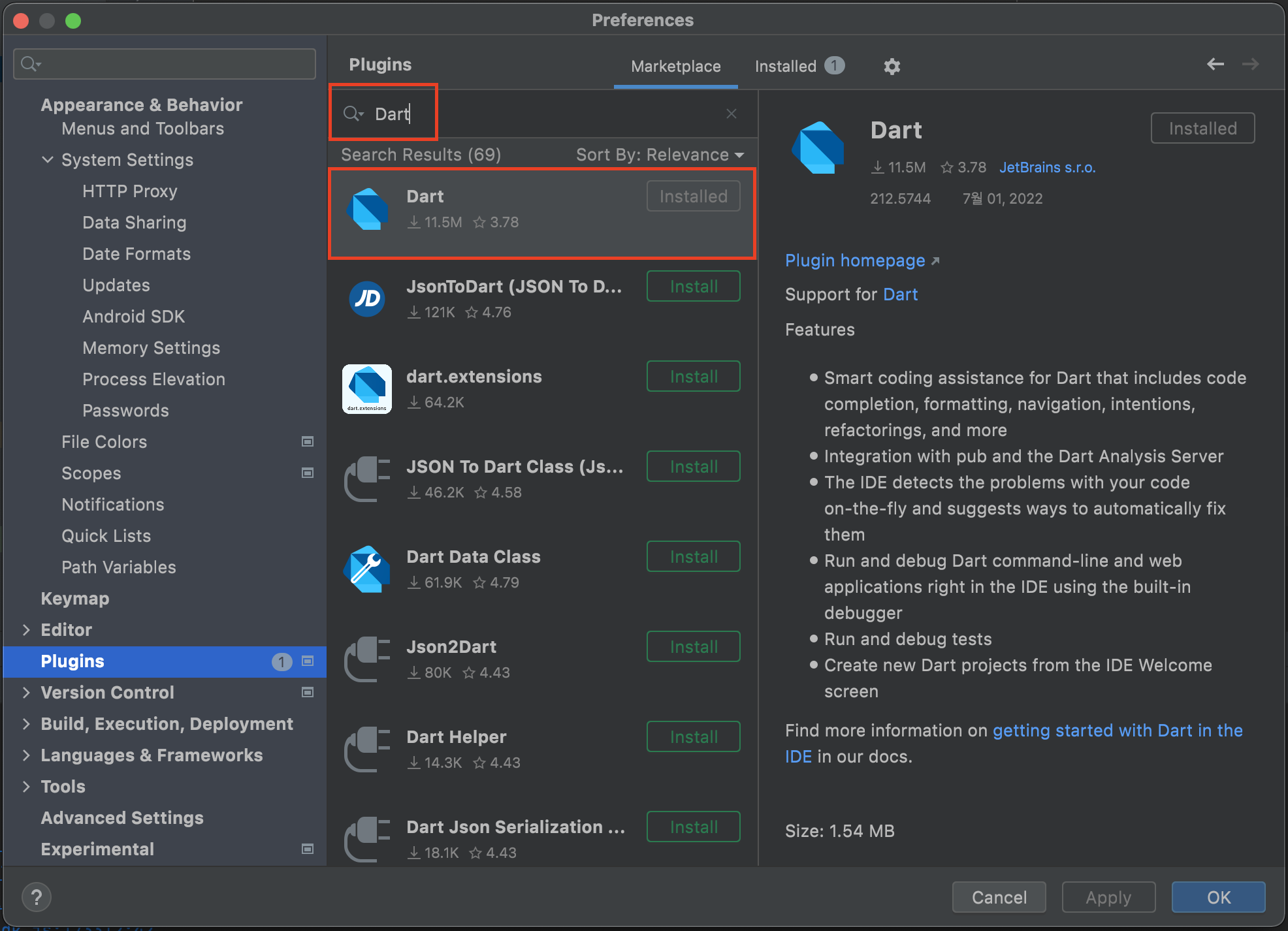 Android Studio > Preference > Plugins 에서 Flutter, Dart 설치. Dart 설치의 경우 Flutter를 설치하면 자동으로 설치됨.
