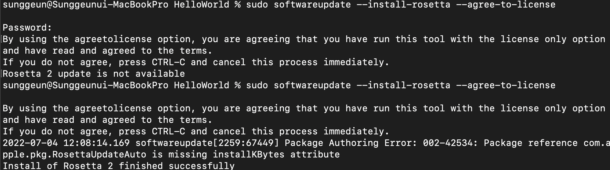 $ sudo softwareupdate --install-rosetta --agree-to-license