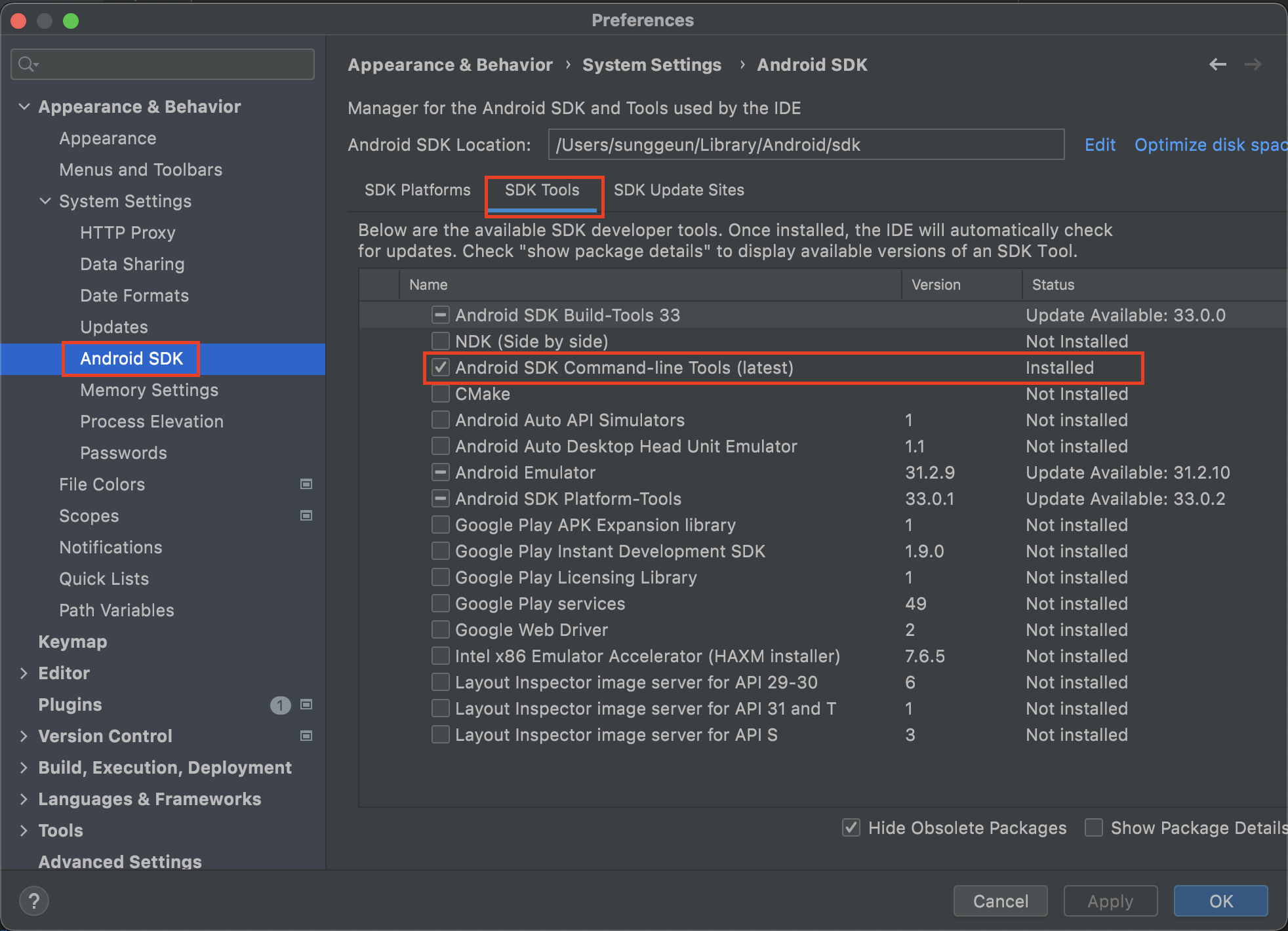 - Cmdline-tools compoent is missing 오류 대처. Android Studio Preference에 진입해 해당 Tool이 제대로 설치 되었는지 확인.