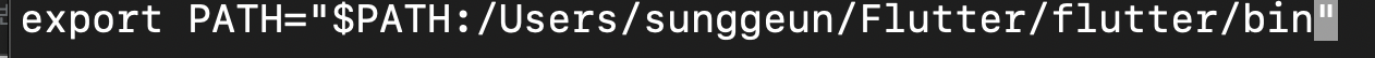 환경변수 설정파일 저장후 종료. 터미널을 종료한뒤 $ flutter doctor가 정상 동작 하는것 확인.